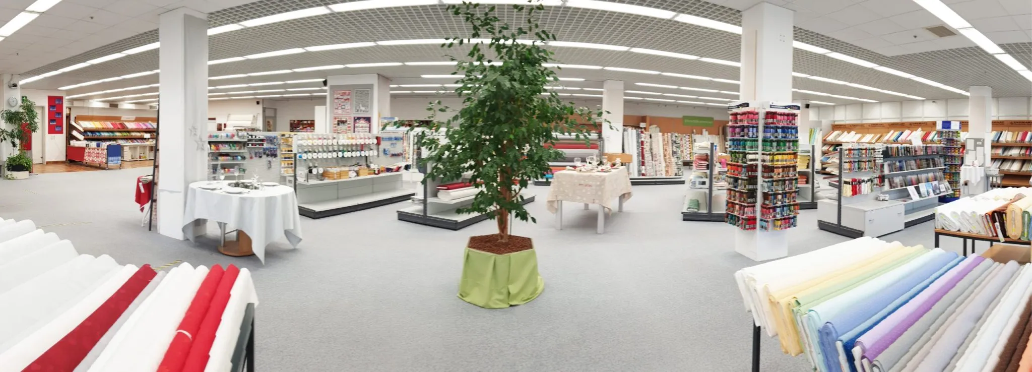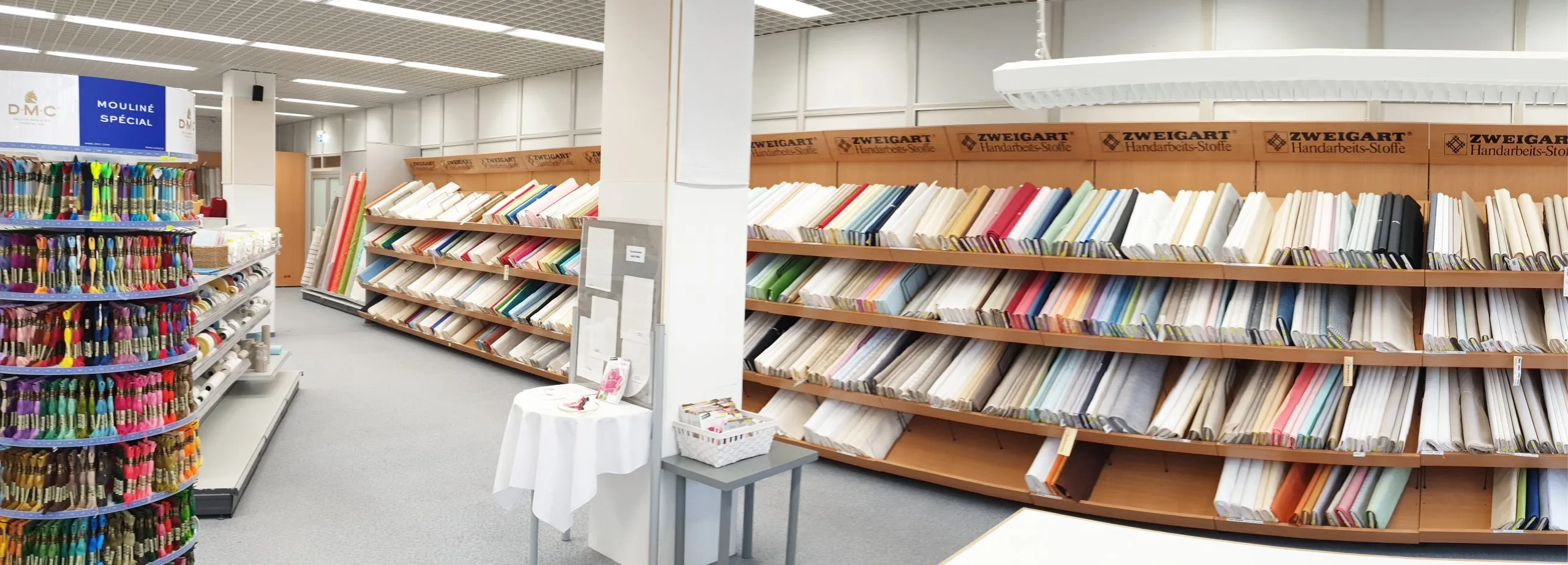 In unserem Fabrikverkauf finden Sie auf 650 m2 Verkaufsfläche eine große Auswahl rund um’s Handarbeiten, Heimtextilien und vielem mehr. Wir führen in großer Auswahl: Hochwertige Stoffe zum Sticken aus eigener Produktion, Tischdecken und Sets nach Maßanfertigung, vielseitige Patchworkstoffe international bekannter Designer inkl. Zubehör, Stramine, Stick- und Häkelgarne, Handstrickgarne, Spitzen, Bänder, Borten, Knöpfe, Kurzwaren und vieles mehr.